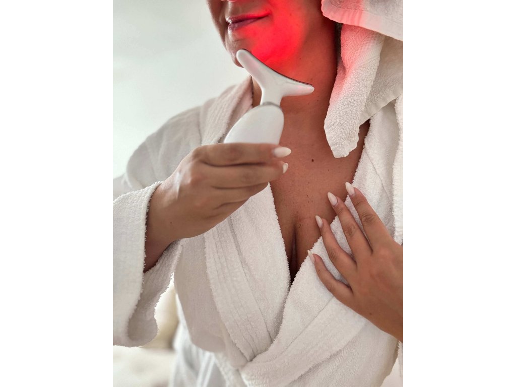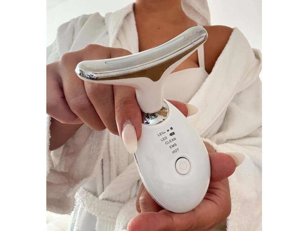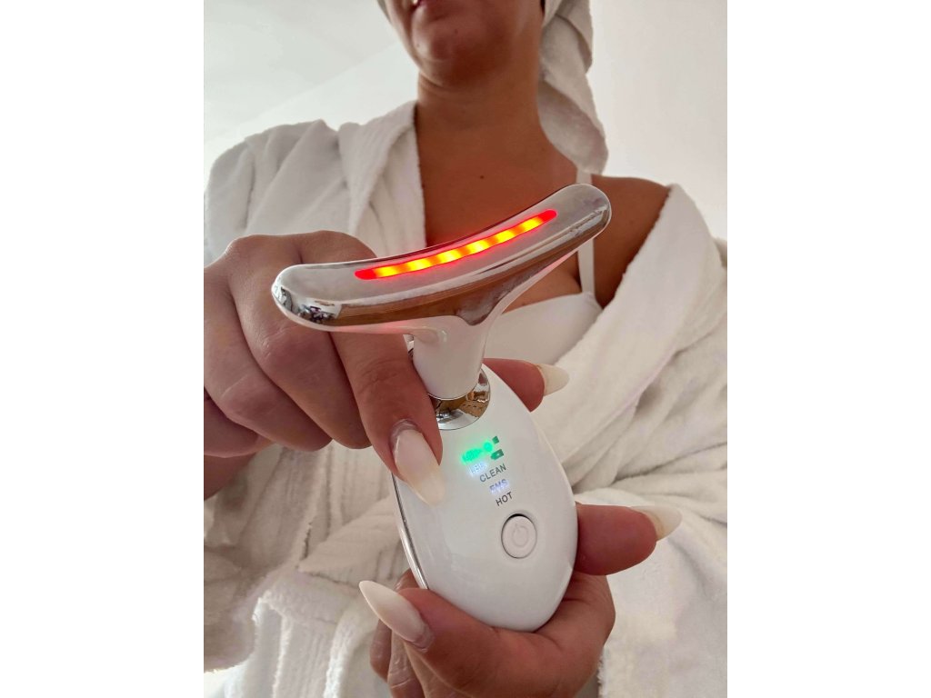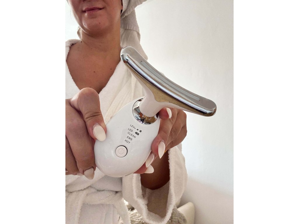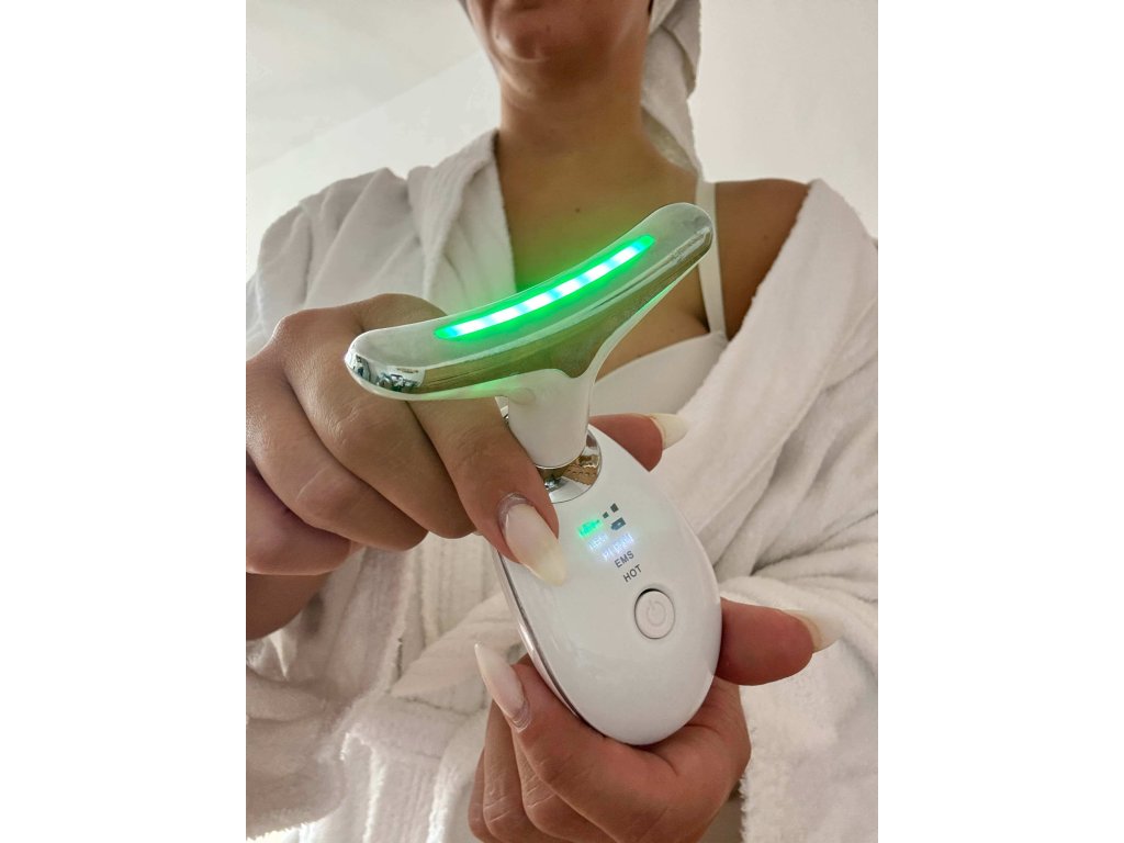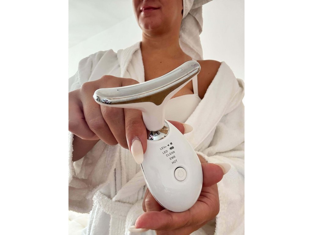 Luxusný liftingový prístroj 4v1 pre tvár, krk a dekolt. Kombinuje LED terapiu, EMS stimuláciu, hĺbkové čistenie a tepelnú masáž pre žiarivú a pevnú pleť.